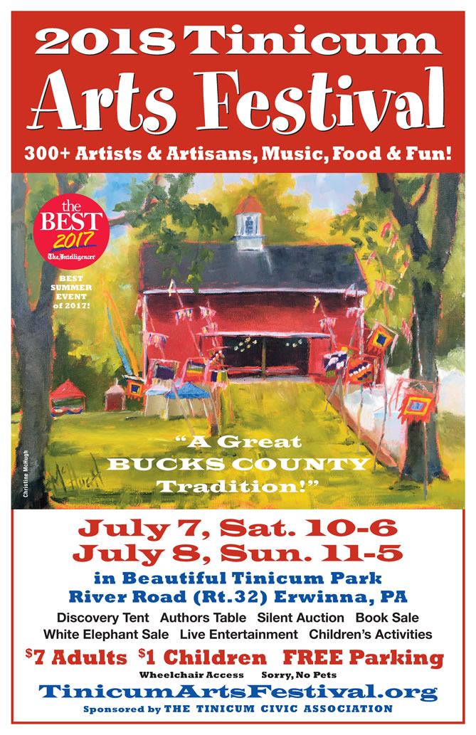A Great Bucks County Tradition, the Tinicum Arts Festival returns to the shady grounds of Tinicum Park. Gather with friends and neighbors to enjoy the works of over 180 regional artists in the centerpiece Art Barn. Delight in the creations of over 130 artists and craft artisans displayed under the trees. Discover treasures at the White Elephant Tent. Choose from literally thousands of volumes at the Book Wagon. Place a bid at the Silent Auction. Enjoy outstanding live musical entertainment while savoring a fresh-squeezed lemonade, a tasty sandwich or a home-baked desert in the picnic grove. Special activities for children and summer fun for everyone at the Tinicum Arts Festival. Be part of the fun. There are lots of ways to be involved. If you can chair a committee, distribute posters, work several hours at the festival itself, or if you have ideas you would like to share, please call 610-294-9420 and leave a message, or write to the Tinicum Arts Festival, PO Box 106, Erwinna, PA 18920. The Tinicum Arts Festival is the primary fundraiser for the non-profit Tinicum Civic Association. The Festival is planned and run entirely by volunteers. Proceeds are used to maintain the 1832 Stover Mill in Erwinna and to benefit over 30 other non-profit organizations that serve Tinicum Township. Tinicum Civic Association Contact us regarding any questions you might have at craftfest@verizon.net. |